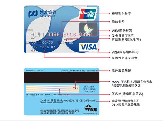 3.Mark of UnionPay organization, your card number, Visa anti-fake label, date of issue (month/year), maturity date of valid period (month/year), mark of Visa international organization, Pinyin of your Chinese name, offshore service hotline, CVV: on the signature column and following the last three digitals of the card number is the security verification and signature column (please sign your name promptly), 24-hour hotline of SPDB credit card center.